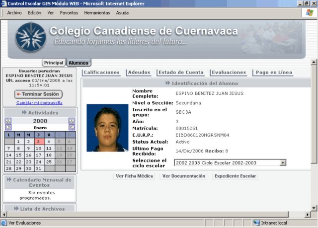 Al ingresar Control Escolar GES para Internet como Alumno, tendremos acceso a la información del sistema, académica y administrativa de los propios alumnos, así como a elementos de colaboración entre el alumno y otros usuarios del sistema. Si nuestros datos de acceso (nombre de usuario y contraseña) son correctos aparecerá la siguiente ventana desde la cual tendremos acceso a diferentes opciones: