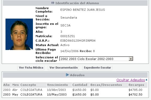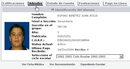 Para consultar los Adeudos de un alumno haga "clic" en la pestaña [Adeudos] desde la ventan de información de un alumno.