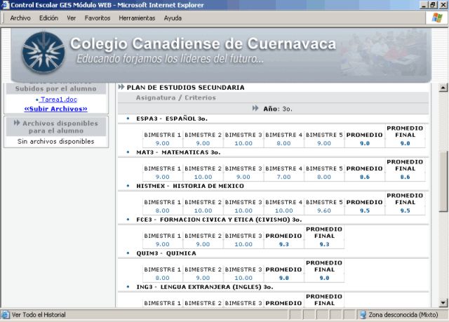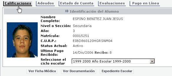 Inmediatamente, observaremos las calificaciones del Alumno del ciclo escolar seleccionado.