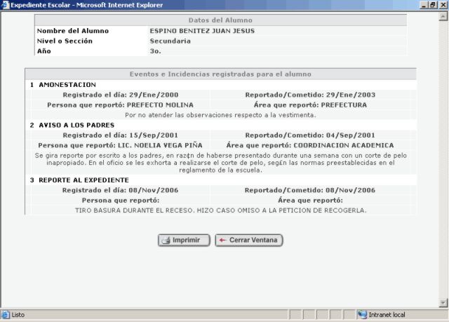 El expediente escolar consiste en el registro de eventos e incidencias para un alumno, tales como Reportes, Felicitaciones, Amonestaciones, Suspensiones, etc.